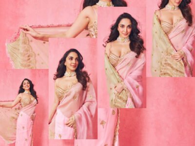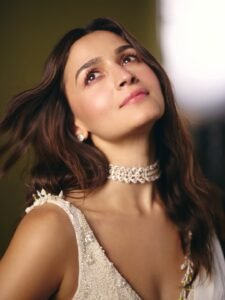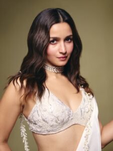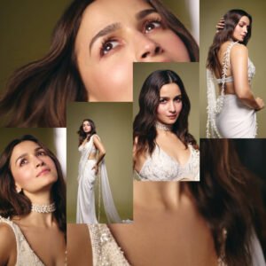 Alia Bhatt exudes understated elegance in a custom Mogra saree by Gaurav Gupta. The look carries an ethereal quality, defined by its soft drape and delicate detailing that enhances her natural grace.