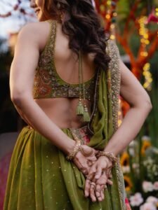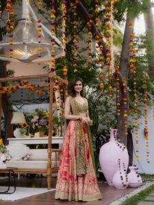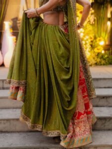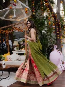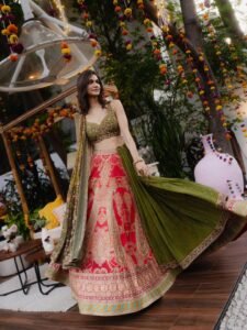 The ensemble reflected the designer’s signature heritage aesthetic, with rich textures and traditional detailing adding depth to the outfit. By combining a lehenga with a saree-style drape, the look blended vintage elegance with contemporary styling, making it both unique and culturally rooted.