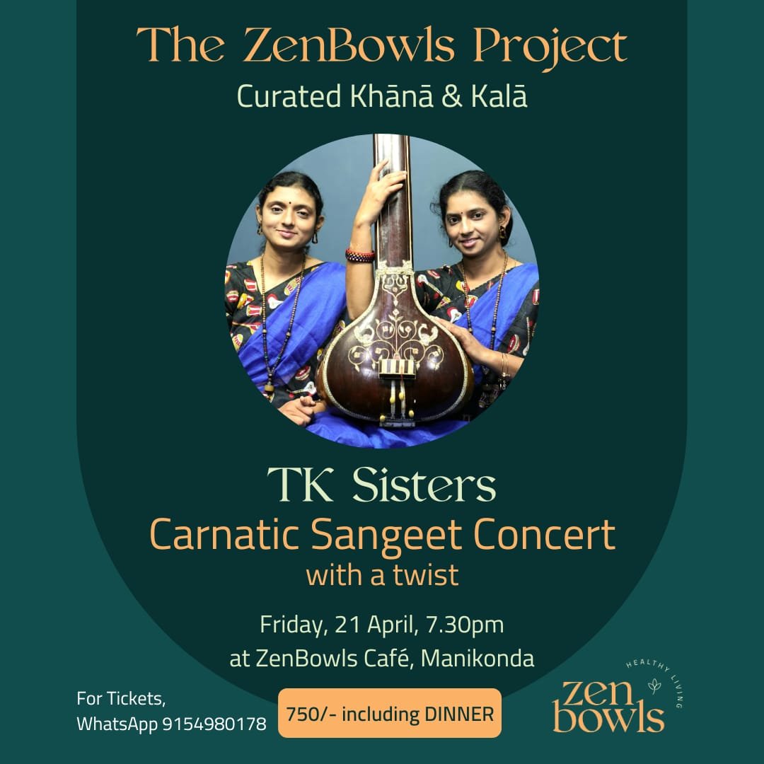 The ZenBowls Project Curated Khānā & Kalā presents TK Sisters in a Carnatic Sangeet Concert with a Twist. Dr. TK Saroja & Dr. TK Sujatha, accompanied by Sri Dinakar Ramaraju on Violin & Sri Uday Kumar Nari on Tabla will take you through an unforgettable journey through Indian Classical Music.