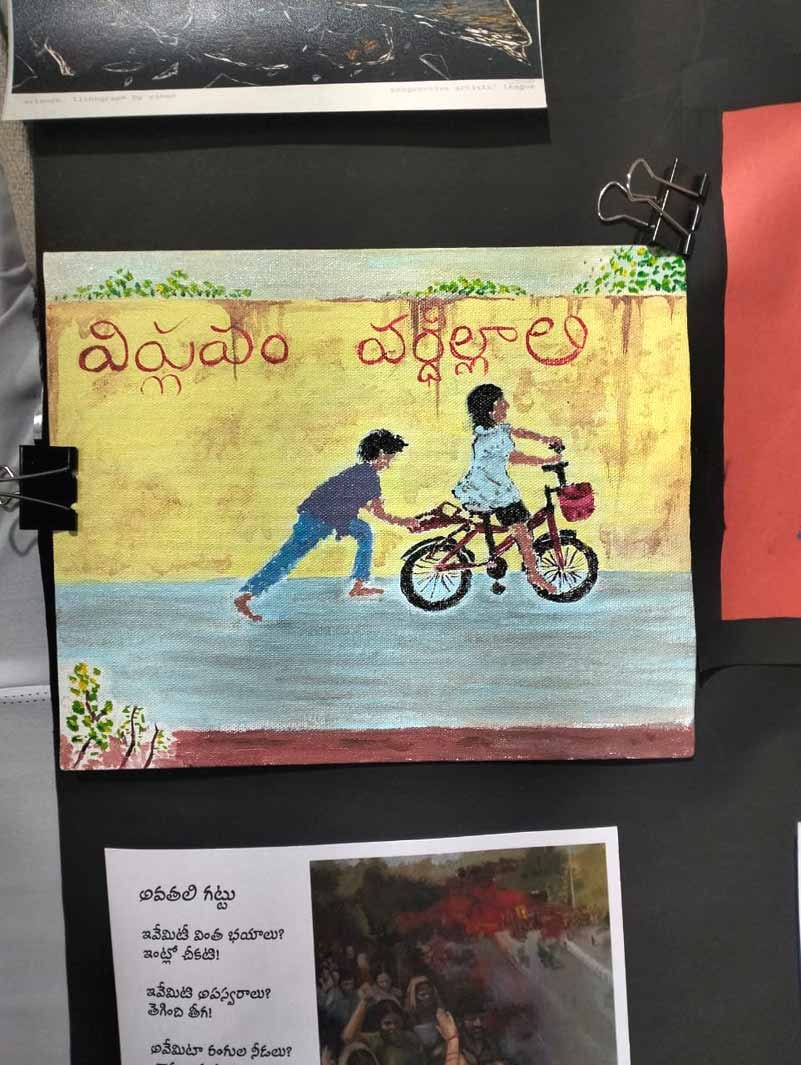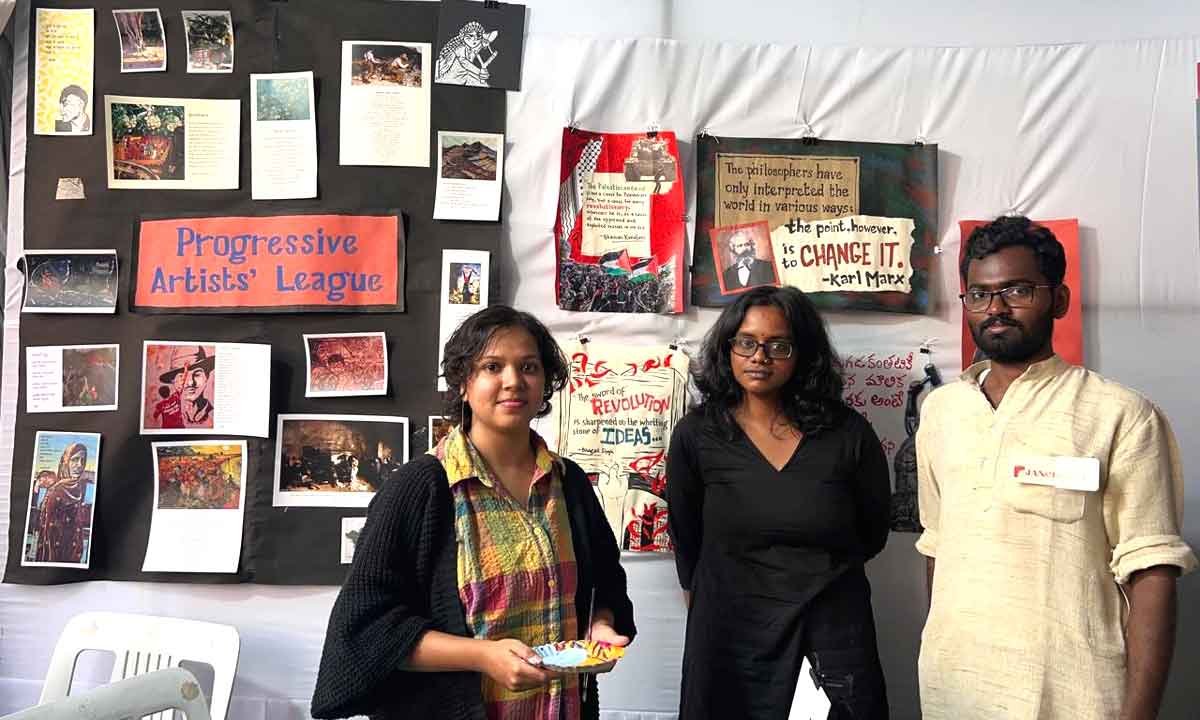 Canvas Rebels in the House of Pages; Hina, Sreeja, and Mahipal bring the Progressive Artists League’s street-smart revolution to Hyderabad Book Fair 2025- Where walls meet words, and art hungers for all.