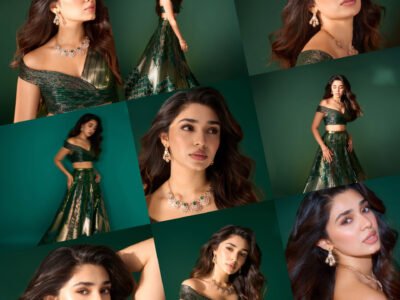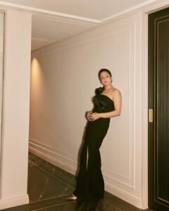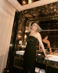 Jyothika makes a powerful style statement in a striking black custom western ensemble by Gaurav Gupta. The outfit reflects the designer’s signature sculptural aesthetic, blending sharp structure with fluid elegance to create a look that feels both modern and dramatic.