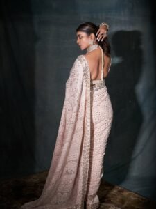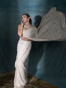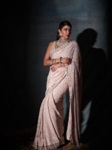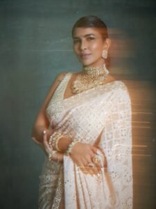 A recent look featuring Lakshmi Manchu showcases how thoughtful styling can turn excess into elegance. Draped in a delicate Chikankari saree, the look is elevated with layered jewellery—from a statement choker to cascading necklaces and stacked kadas.