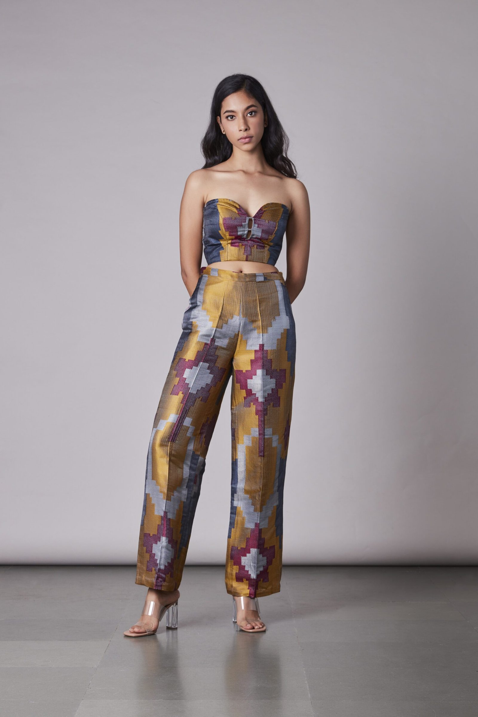 This season Saaksha Kinni embark on the world of pixelated prints. A look back at their design journey reflects their fascination with print. More than its mere shape, they wanted to include layers of shading, pixilation and tones of the same colour to add depth and that’s why this season the main focus is on pixilation. Their ikat motifs, stripes, scratch and shaded prints all have been pixelated, enlarged and shaded. Thus, creating rich, bold and exciting shapes and textures.