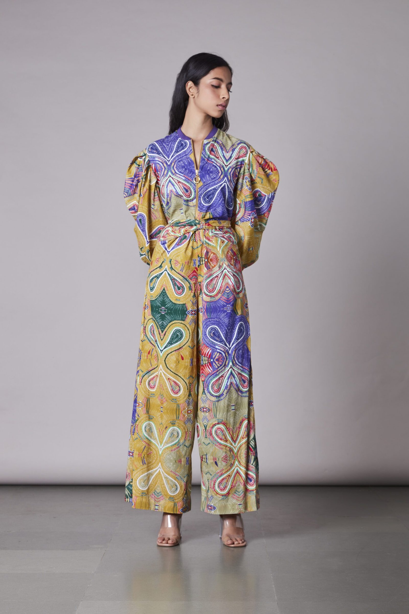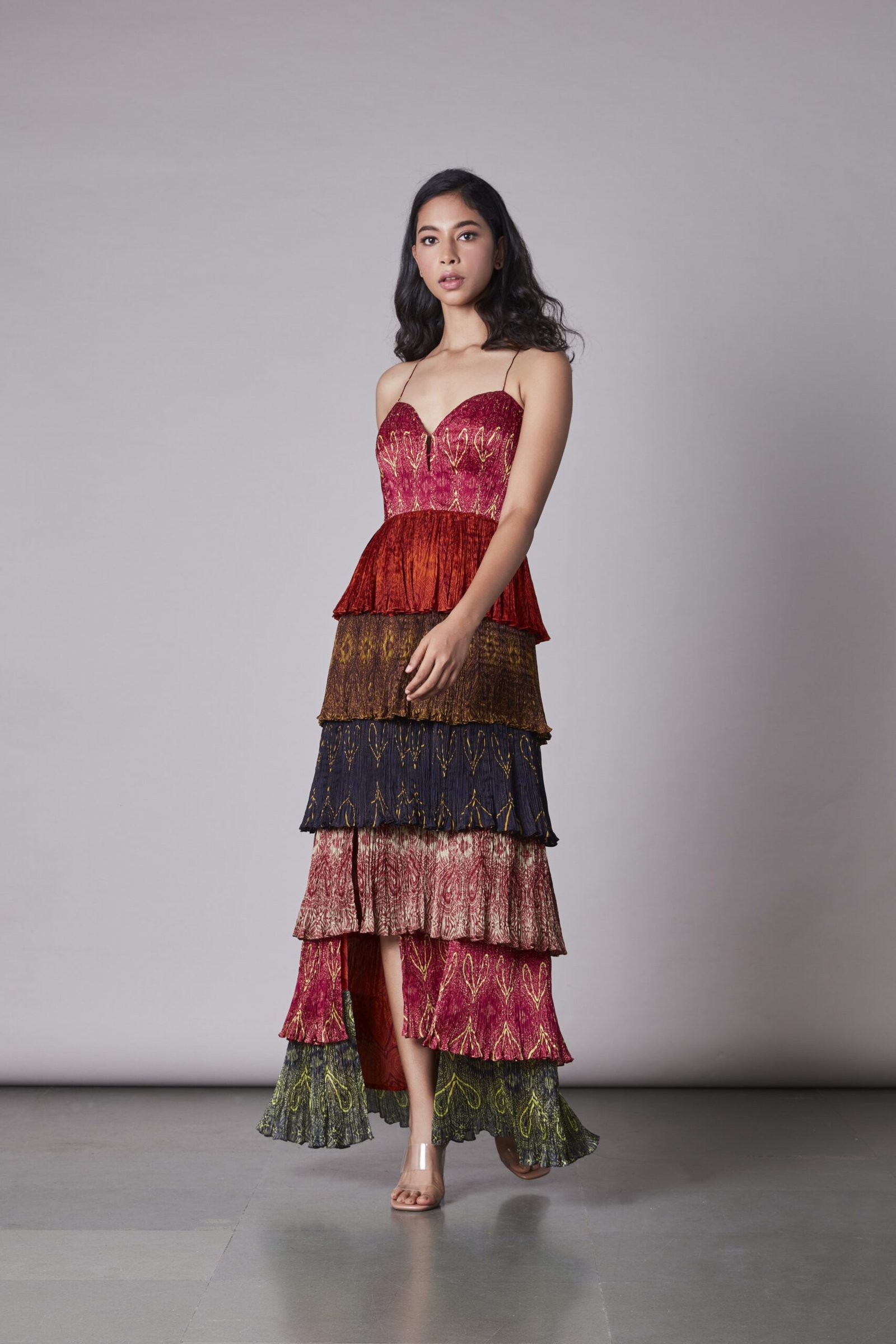 The latest collection by designers Saaksha Kinni includes various silhouettes like draped sari dresses, layered dresses, and co-ord sets. Styles are conceptualised to be timeless, easy to mix and match. The pops of colours used are bright and enigmatic and the colour palette includes shades of Pinks, purples, greens and blues. Colours that inspire you to travel once again, to host guests, and to simply lounge in whilst feeling good.