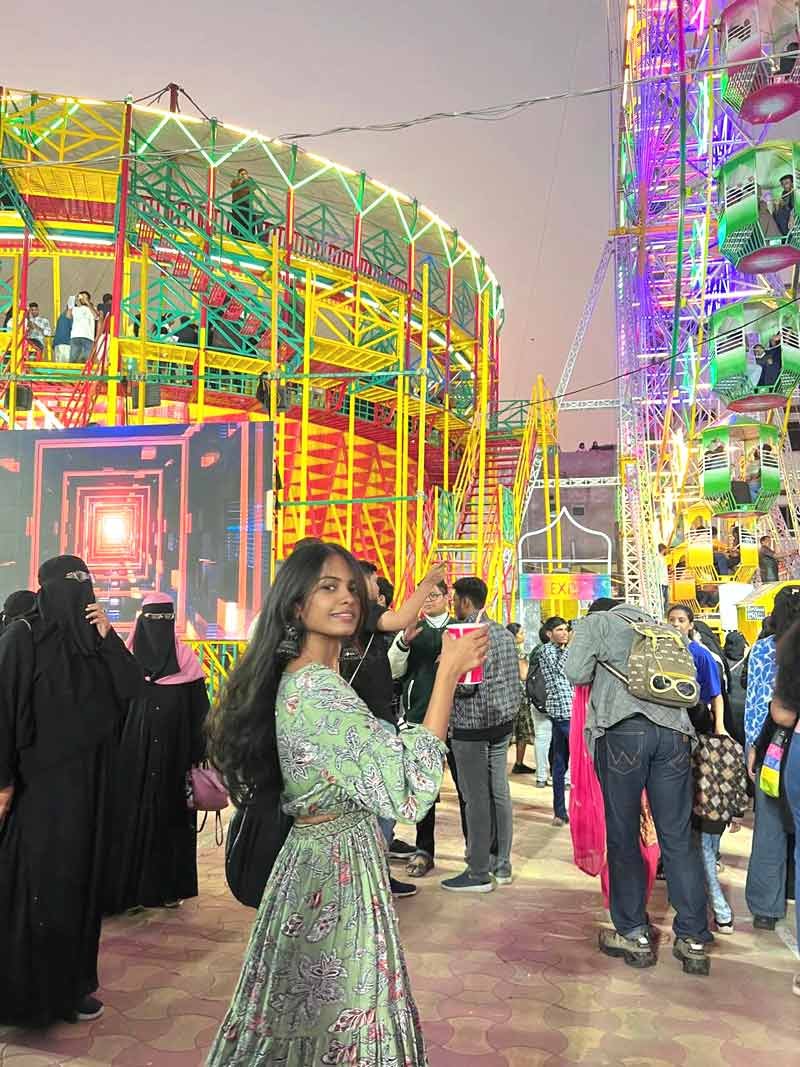 “Adrenaline rush at Numaish: Ferris wheels and roller coasters light up Nampally nights for family thrills!”