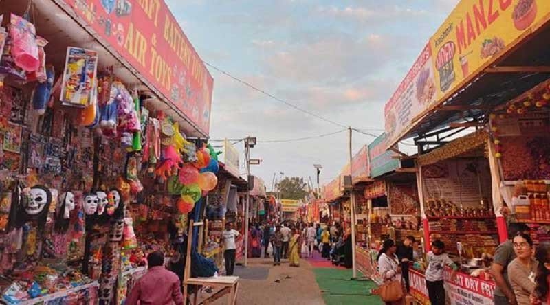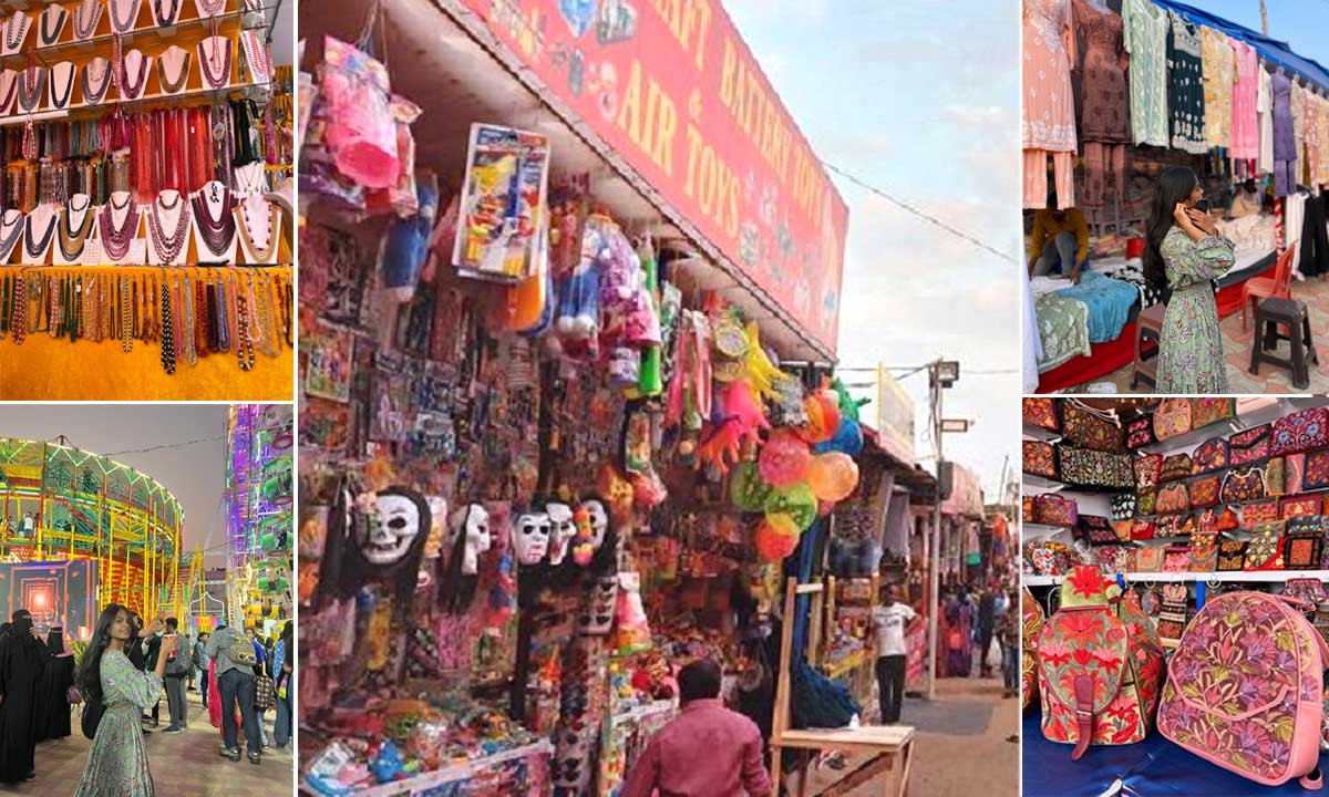 “Bustling bargain hub: Numaish stalls overflow with handicrafts, gadgets, and goodies under colorful canopies.”