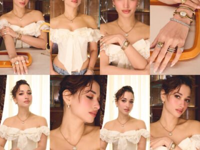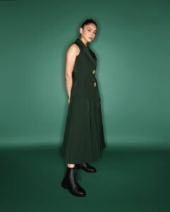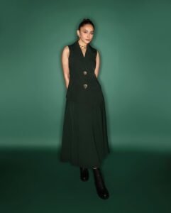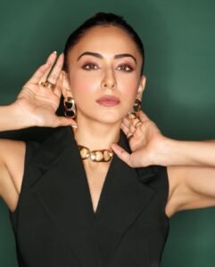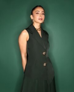 The ensemble comprised a sharp emerald-toned sleeveless blazer paired with a coordinating skirt and bralette, standing out for its structured tailoring and contemporary edge. Designed by The Riot by Juhi Bengani, the look was elevated with confident styling by Rakul Preet Singh, bringing together modern power dressing and bold fashion sensibility.