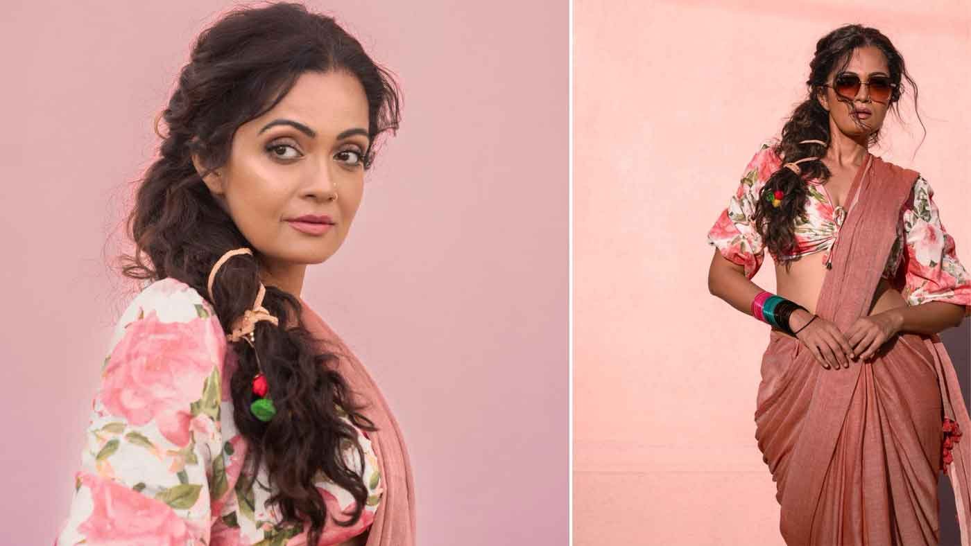 At the heart of this appearance is a light pink-beige Suta saree, chosen for its soft texture and unembellished elegance. The saree is draped in a classic, fuss-free manner, allowing its natural flow to shine—much like the grounded, earthy costumes seen in Mother India. The absence of heavy borders or ornamentation keeps the look honest and timeless. Complementing the drape is a floral-printed blouse, which adds a gentle softness and subtle vintage charm without overpowering the ensemble.