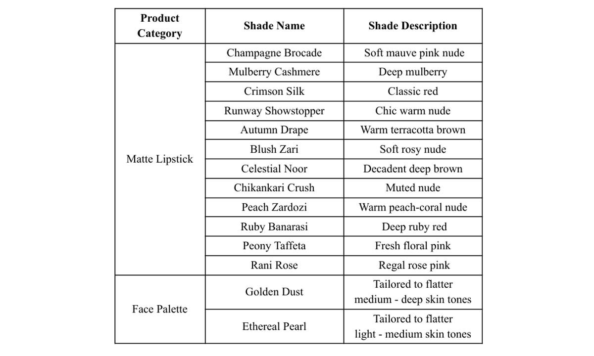 This limited-edition launch introduces an entirely new collection created exclusively for the Kay Beauty × FSP collaboration. The range features 12 full coverage, very luxurious matte bullet lipsticks which feel super lightweight and creamy on the lips and 2 statement face palettes, each crafted with FSP’s signature design language and rooted in the richness of Indian heritage. The face palettes bring together a highlighter, bronzer, shimmer blush and matte blush, offering a complete, multi-dimensional glow in one collectible compact. At the heart of the collection are two standout shades – Champagne Brocade for lighter skin tones and Mulberry Cashmere for deeper skin tones – brought to life through Katrina Kaif’s vision and the artistry of Falguni Shane Peacock. These shades headline the collaboration, offering consumers a wearable piece that elevates everyday beauty.