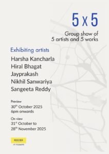 Kadari Art Gallery presents 5 × 5: Five Artists, Five Perspectives, opening on October 30, 2025, at 6 PM in Jubilee Hills, Hyderabad.