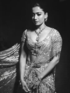 Rashmika stunned in an elegant ivory outfit embellished with sparkling crystals and sapphire accents. The delicate hue highlighted the intricate detailing of the ensemble, while a structured blouse added a sharp, contemporary edge. Sapphire motifs scattered across the outfit shimmered beautifully under the lights, creating a refined yet dazzling effect.