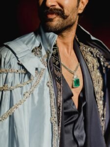 Vijay complemented the look with a dramatic midnight blue velvet long jacket featuring elaborate dragon motifs. The outfit was layered with a powder blue silk cape in a colour-block design, a signature element often associated with the designer duo. An emerald necklace added a striking contrast, completing his regal and statement-making appearance for the evening.