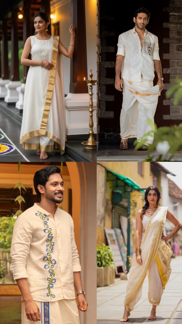 Traditional Kerala attire with a mundu–kurta for the man and a Kasavu saree with blouse for the woman.