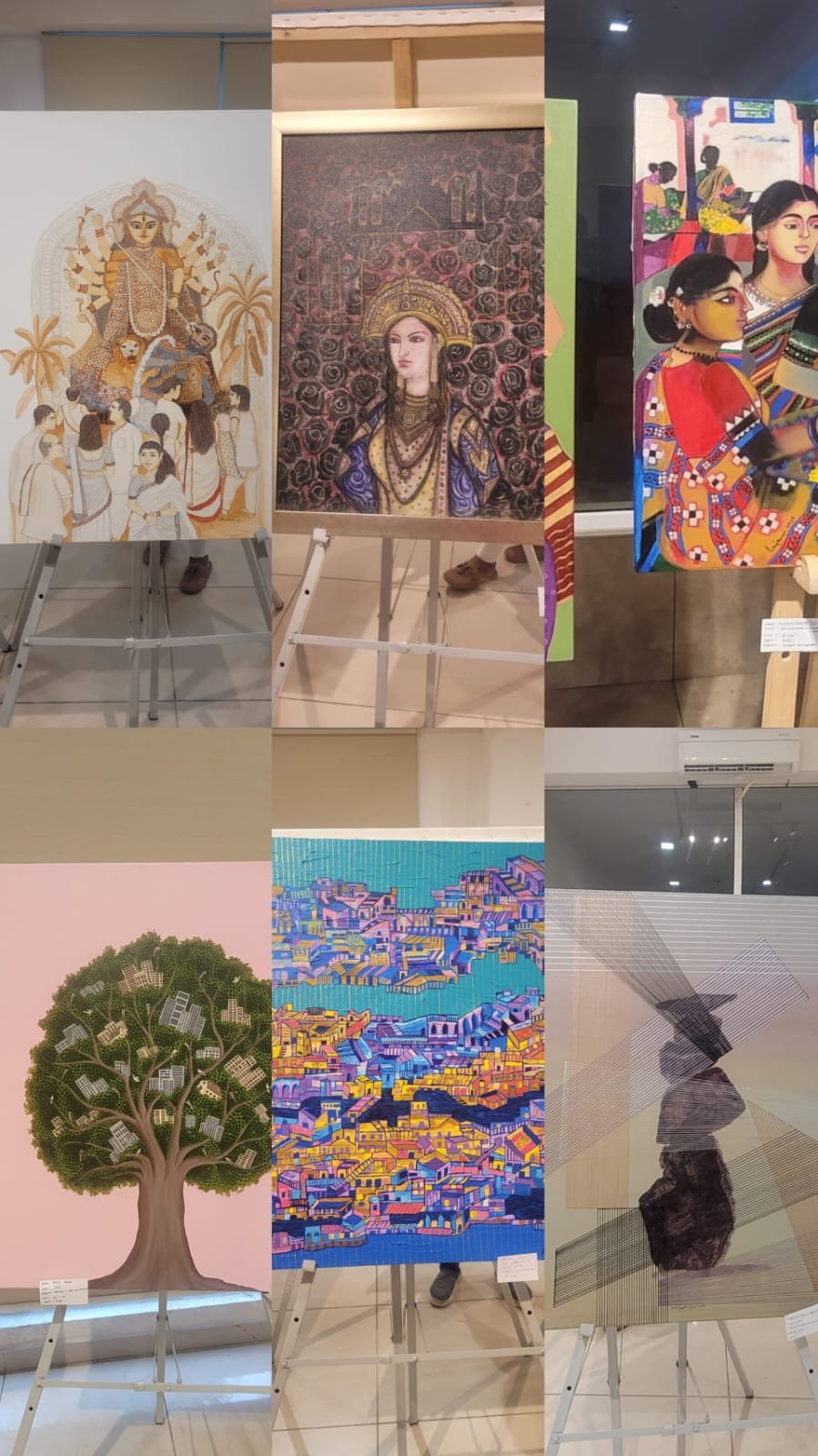 Soul” by Smita Verma shows a lush green tree whose branches bear buildings instead of fruits, blending nature and urbanization against a soft pink backdrop, symbolizing the link between growth and progress.
