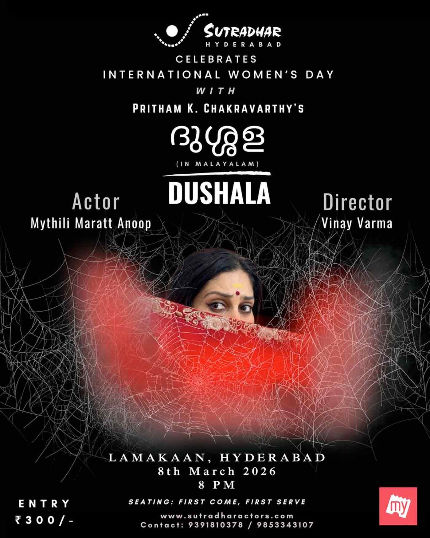 Sutradhar Hyderabad celebrates International Women’s Day with Pritham K. Chakravarthy’s Malayalam play Dushala. Featuring actor Mythili Maratt Anoop and directed by Vinay Varma, the production promises an evocative theatrical experience highlighting powerful storytelling and performance.